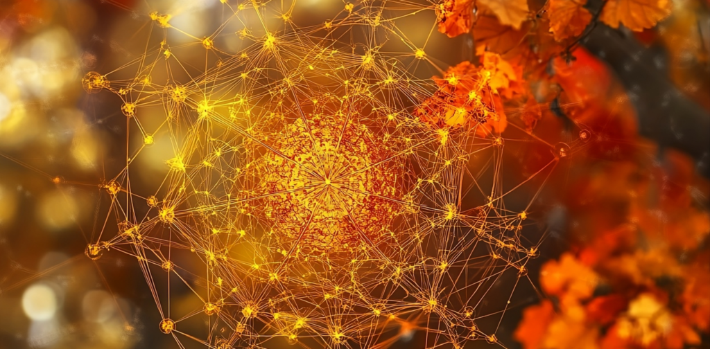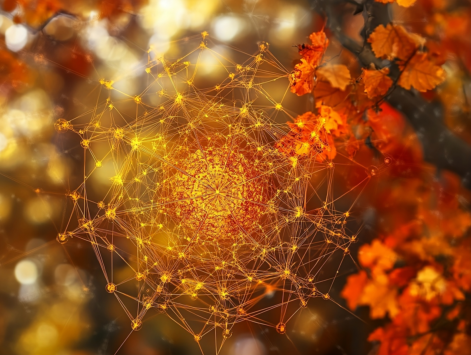 En observant une simple feuille d’automne, j’ai vu la toile secrète du monde se révéler. Des nœuds de lumière, comme des pensées suspendues, se connectaient dans un grand réseau invisible. Chaque feuille, chaque fil d’or, semblait témoigner de la trame complexe de l’univers : tout est lié, tout est fil.